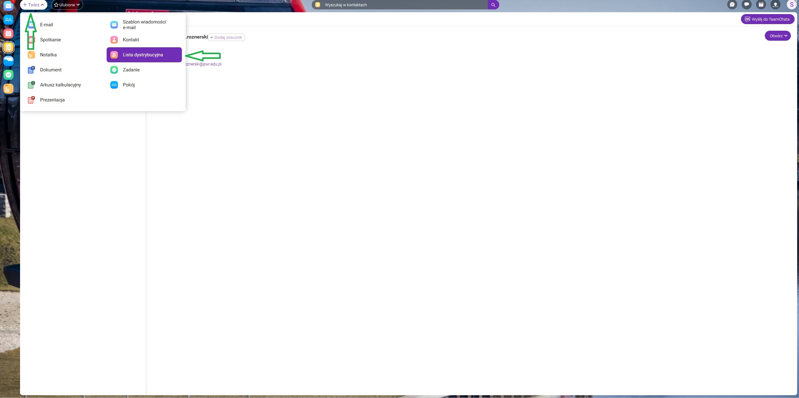 Po zalogowaniu się na konto pocztowe należy na górnej belce po lewej stronie przejść do skrótu (+Twórz) i wybrać odsyłacz do listy dystrybucyjnej.