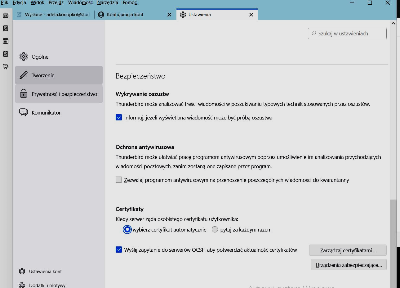 Przechodzimy do sekcji Ustawienie, Prywatność i bezpieczeństwo a następnie do sekcji zarządzania certyfikatami