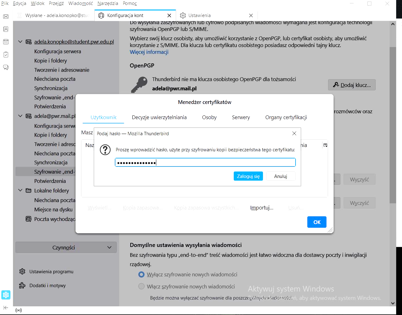 Poniżej podano procedurę dołączenie certyfikatu personalnego którym będą podpisywane wiadomości