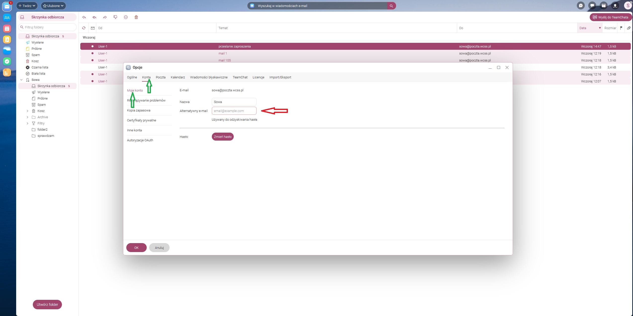 Alternatywny adres e-mail jest bardzo przydatny w przypadku zapomnianego hasła. Aby go skonfigurować, należy skorzystać z zakładki Opcje z lewego panelu i zakładki Konta:
