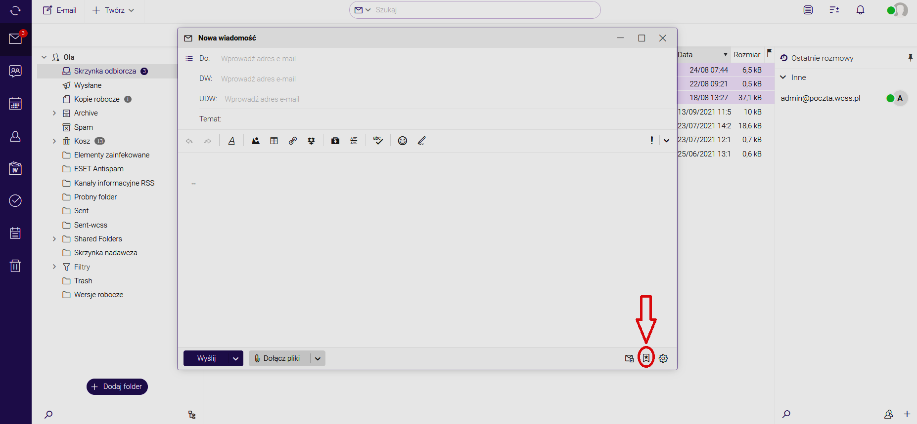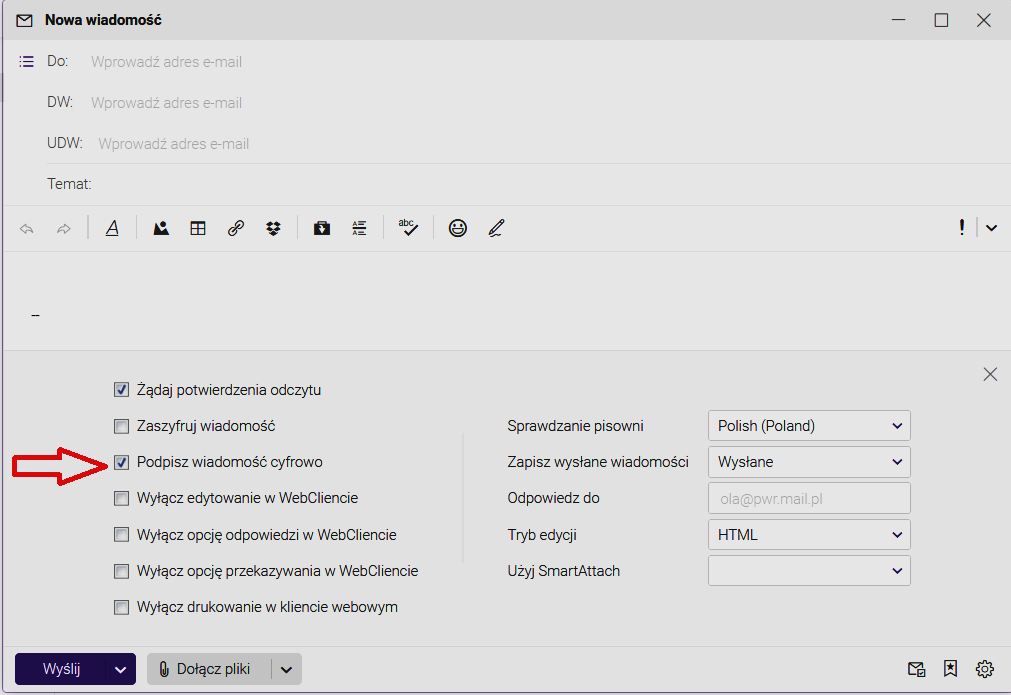 Poniżej przedstawiono sprawdzenie ustawień w systemie pocztowym WCSS
