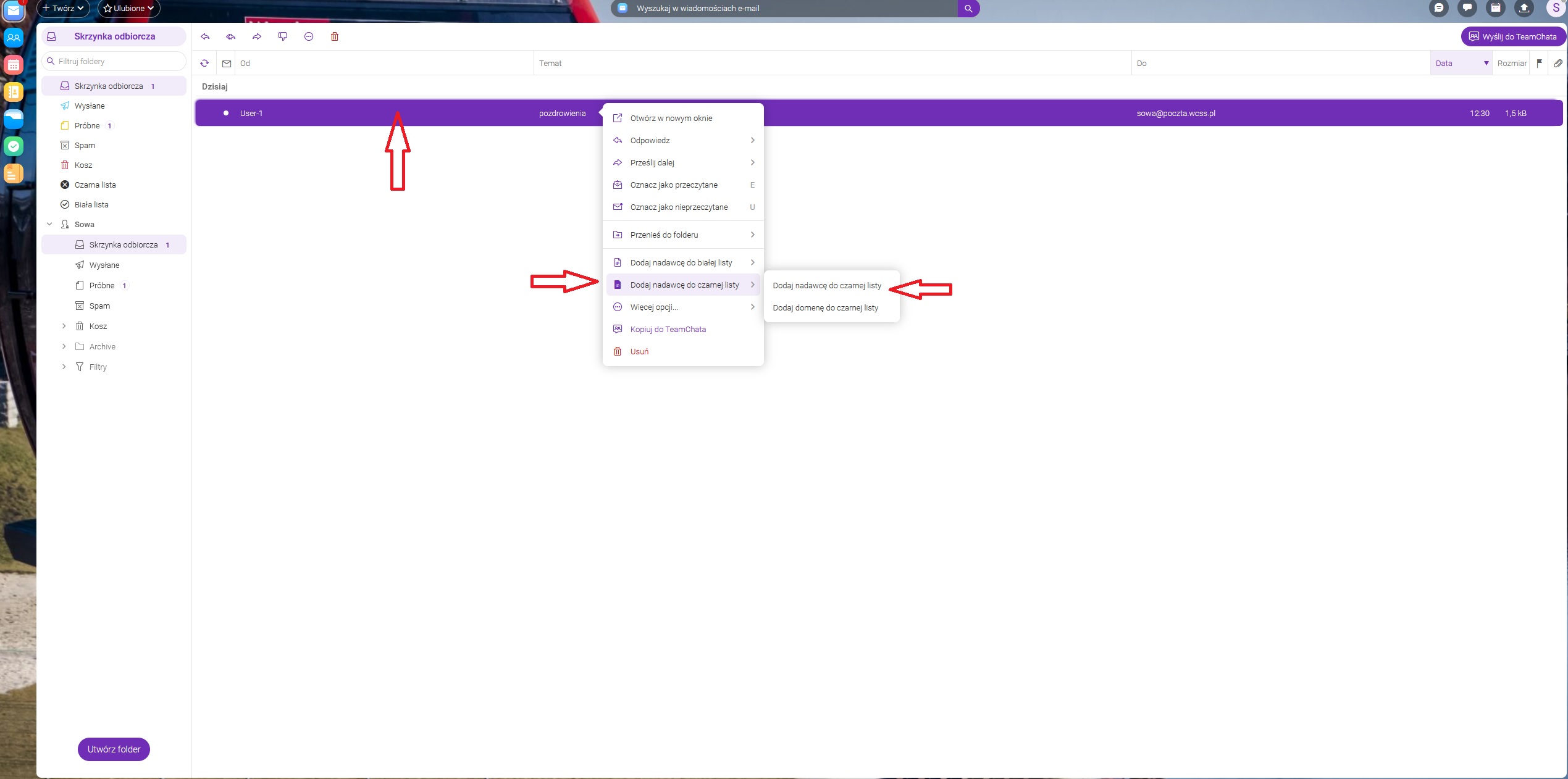 Po zaznaczeniu wybranej wiadomości w zestawieniu wiadomości można prawym klawiszem myszy rozwinąć opcje i wybrać opcję dodania do czarnej listy. Dodawać można adres nadawcy lub całą domenę.