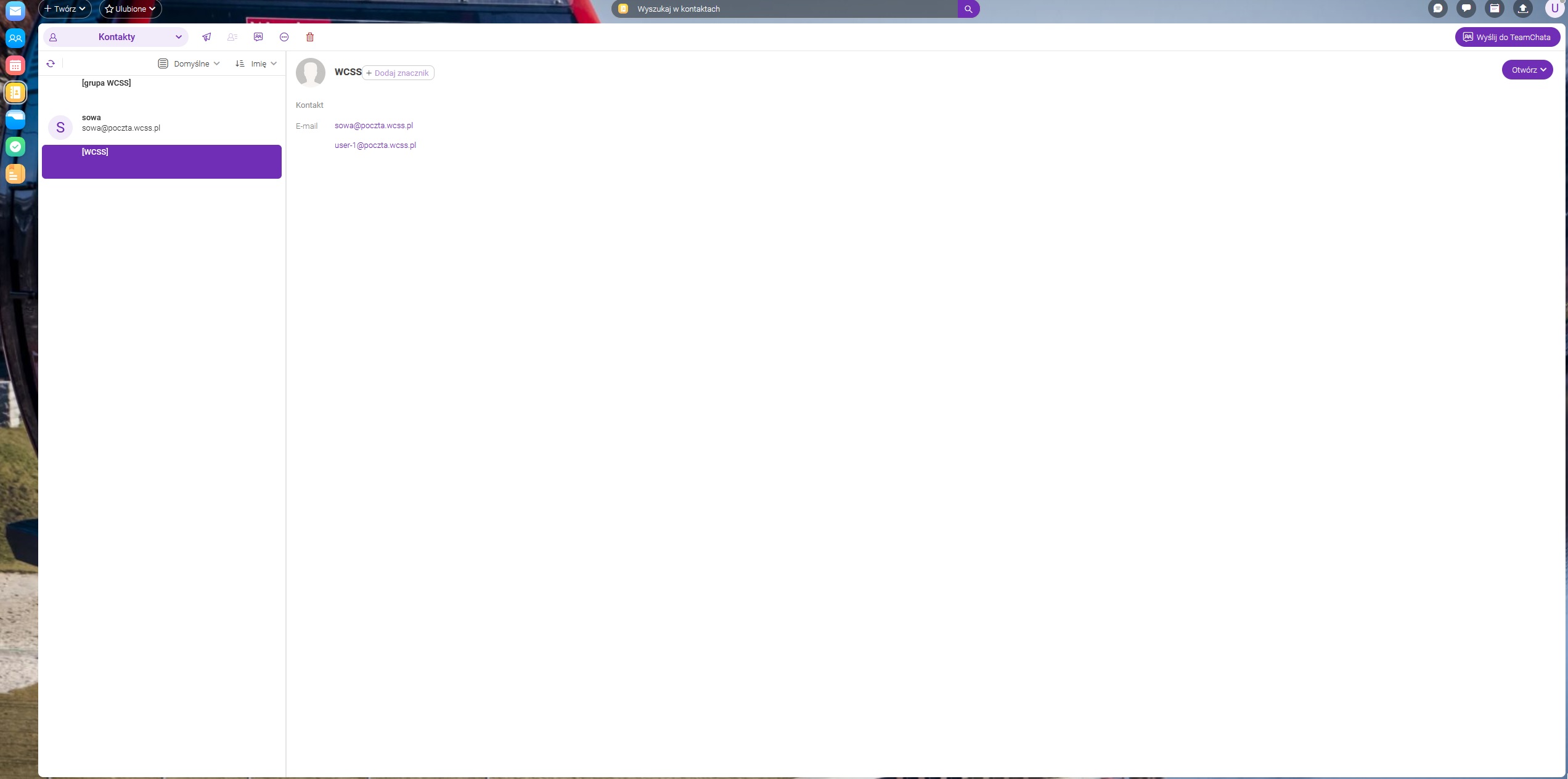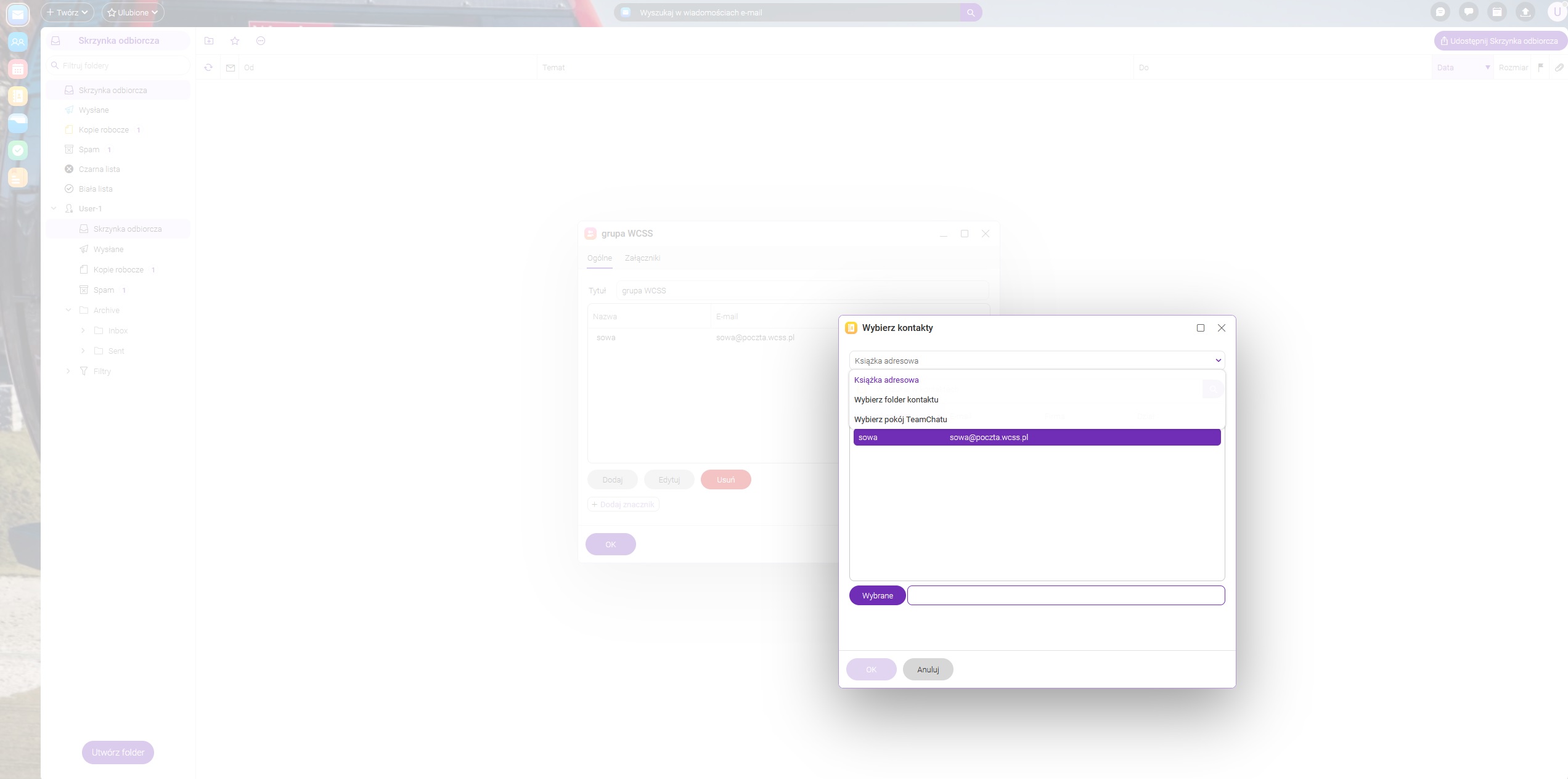 Po wpisaniu nazwy grupy można dodawać poszczególne adresy z folderu kontakty, ksiązki adresowej, teamchatu lub wpisując znane adresy w polu dodaj.