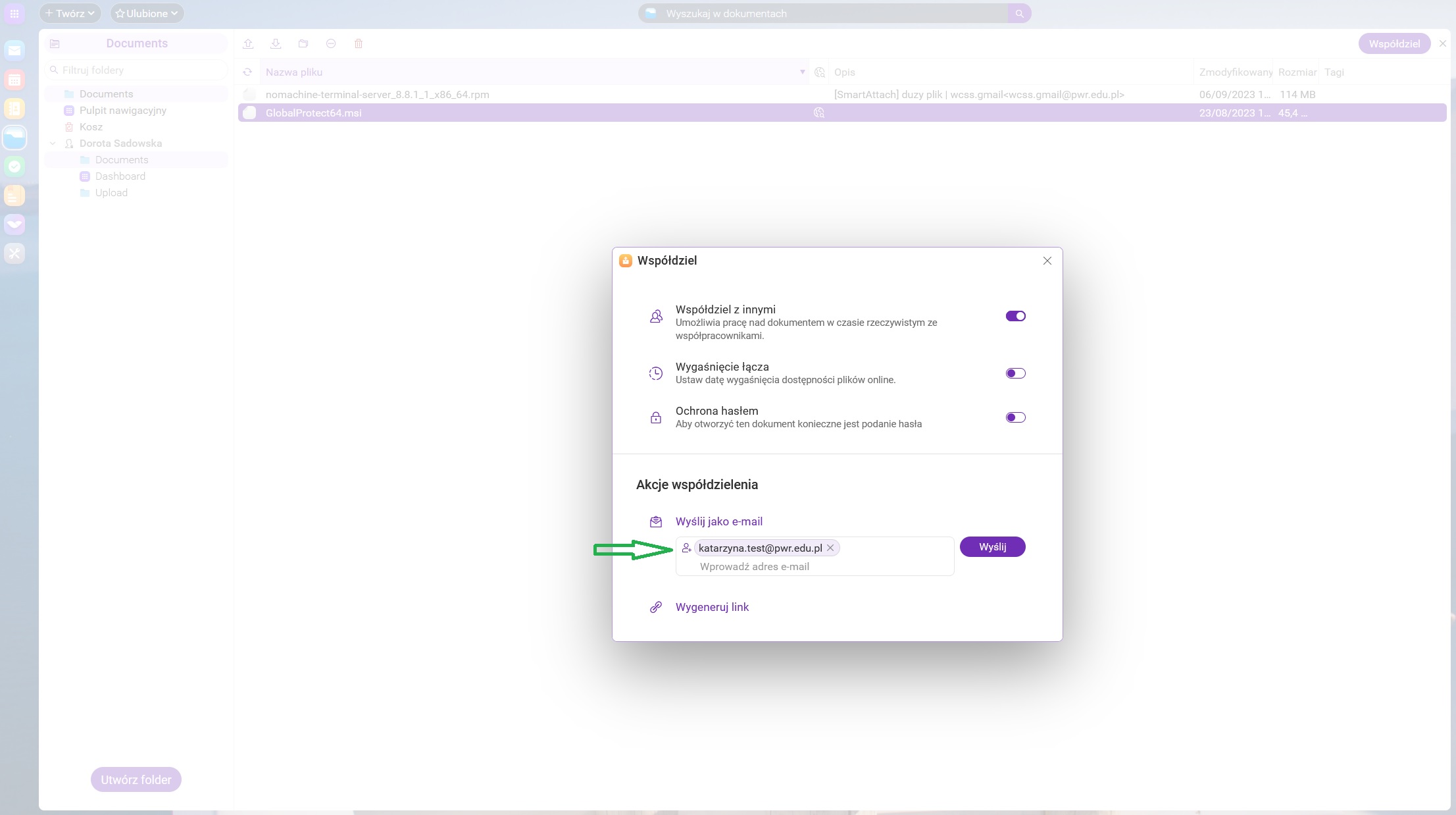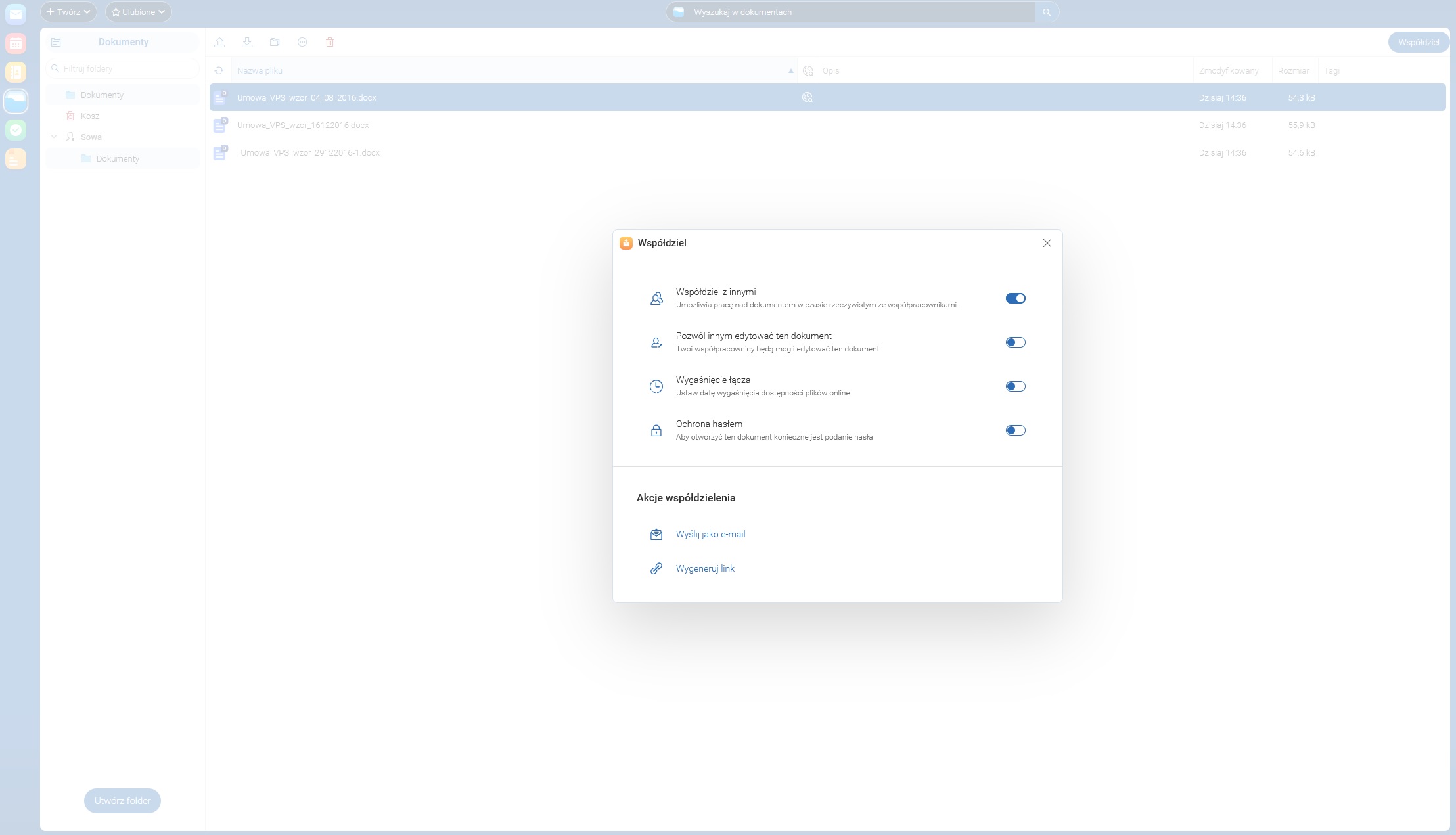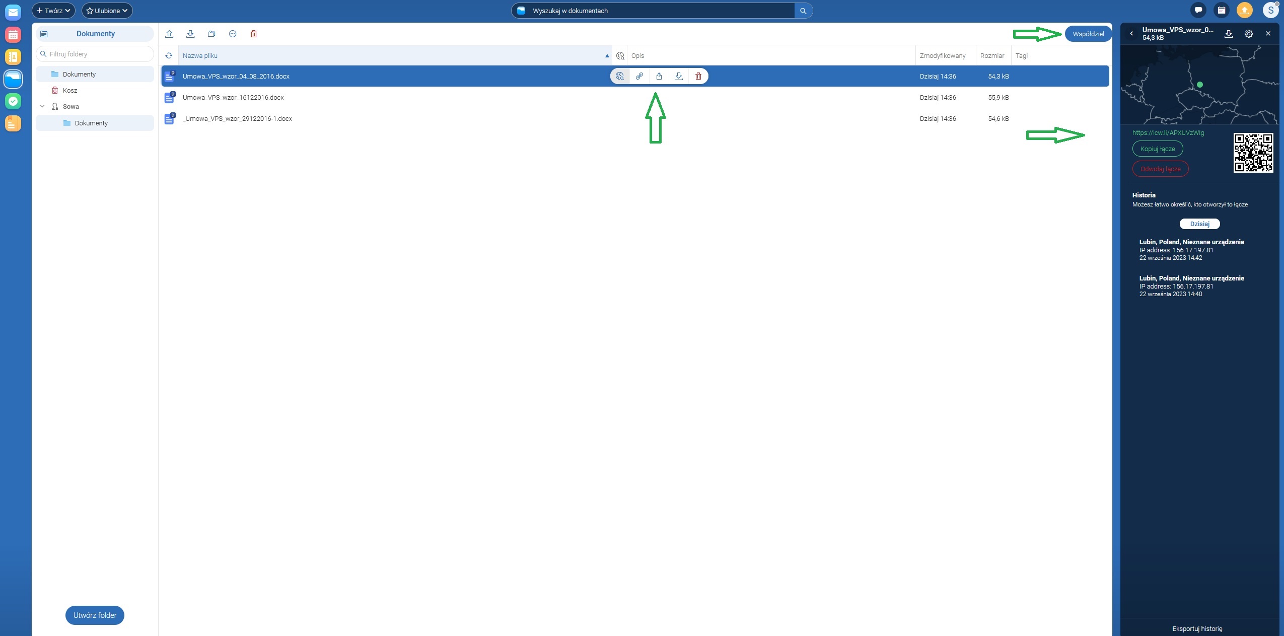 Dokumenty znajdujące się na koncie użytkownika mogą być współdzielone, ale nie mogą być wspólnie edytowane przez osoby, którym dokument został udostępniony. Ograniczenie wynika z braku licencji, która z chwilą zapotrzebowania na taką funkcjonalność może zostać zakupiona. Chcąc współdzielić wybrany plik, wywołujemy funkcje „Współdziel”.