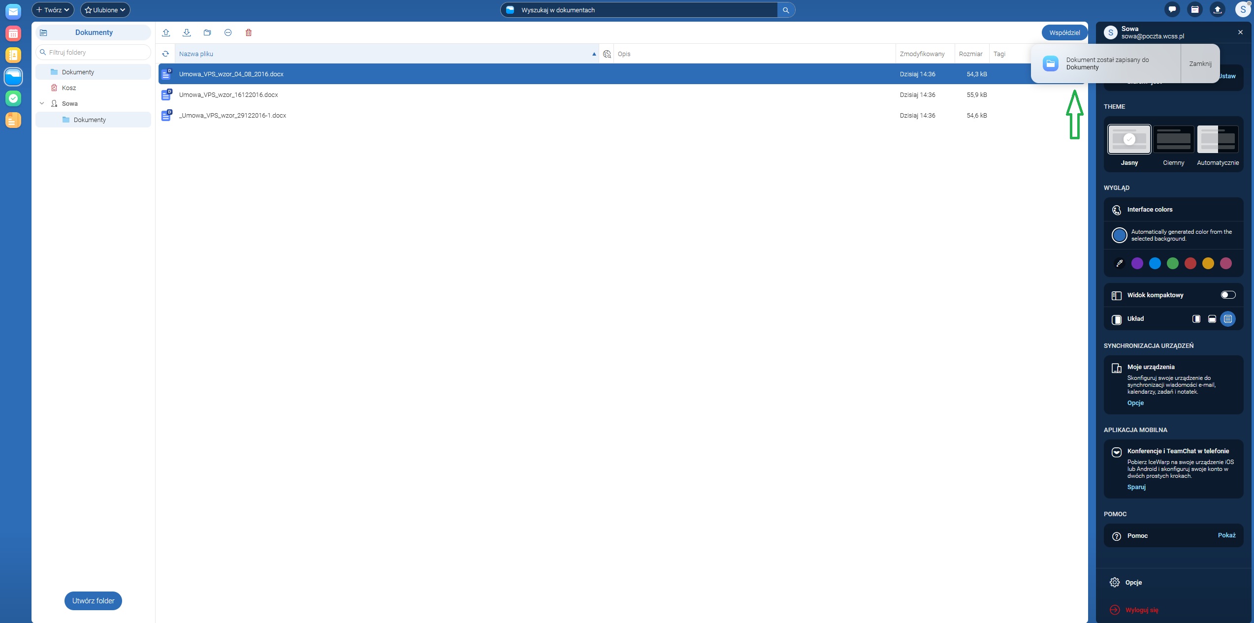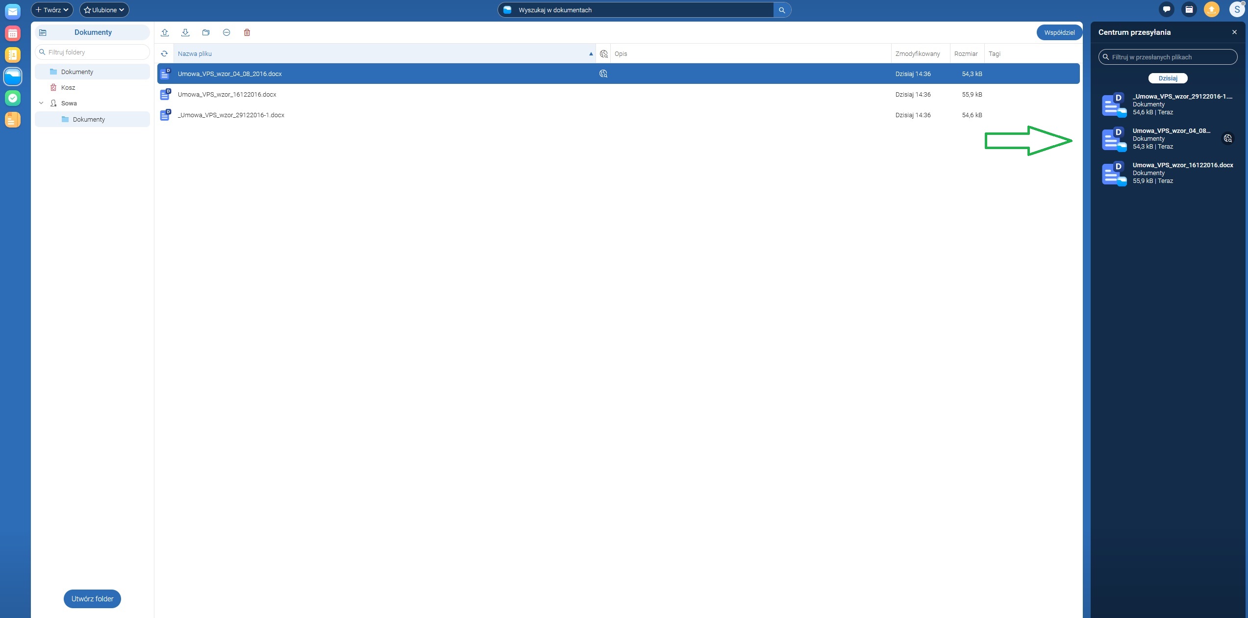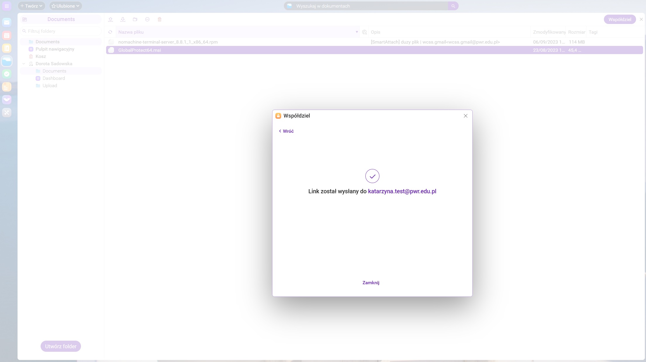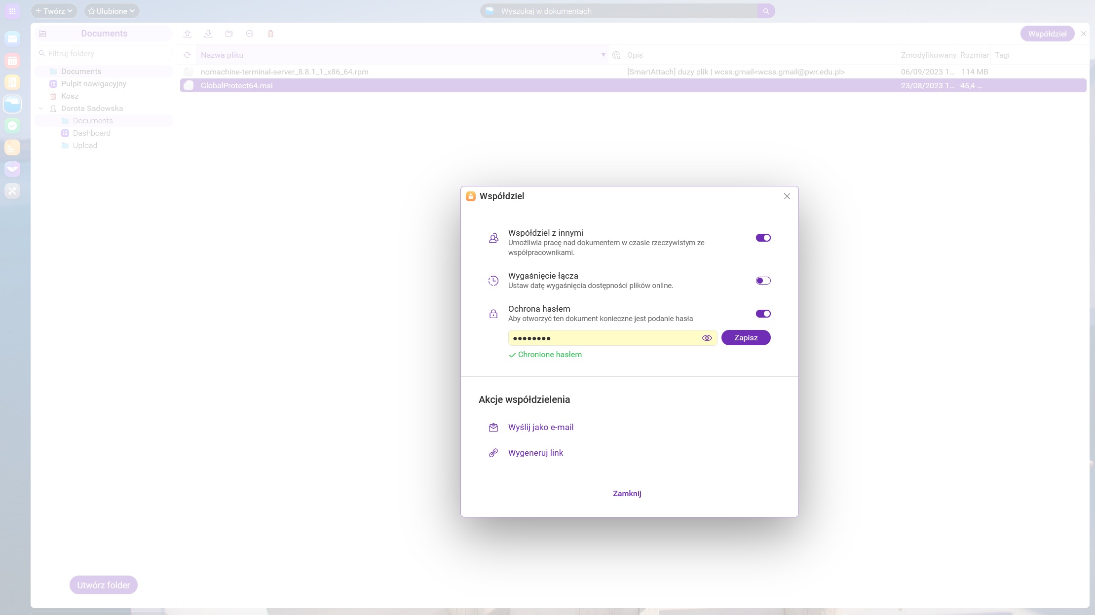 Dokumenty znajdujące się na koncie użytkownika mogą być współdzielone, ale nie mogą być wspólnie edytowane przez osoby, którym dokument został udostępniony. Ograniczenie wynika z braku licencji, która z chwilą zapotrzebowania na taką funkcjonalność może zostać zakupiona. Chcąc współdzielić wybrany plik, wywołujemy funkcje „Współdziel”.