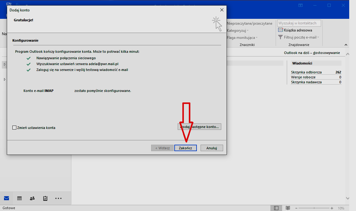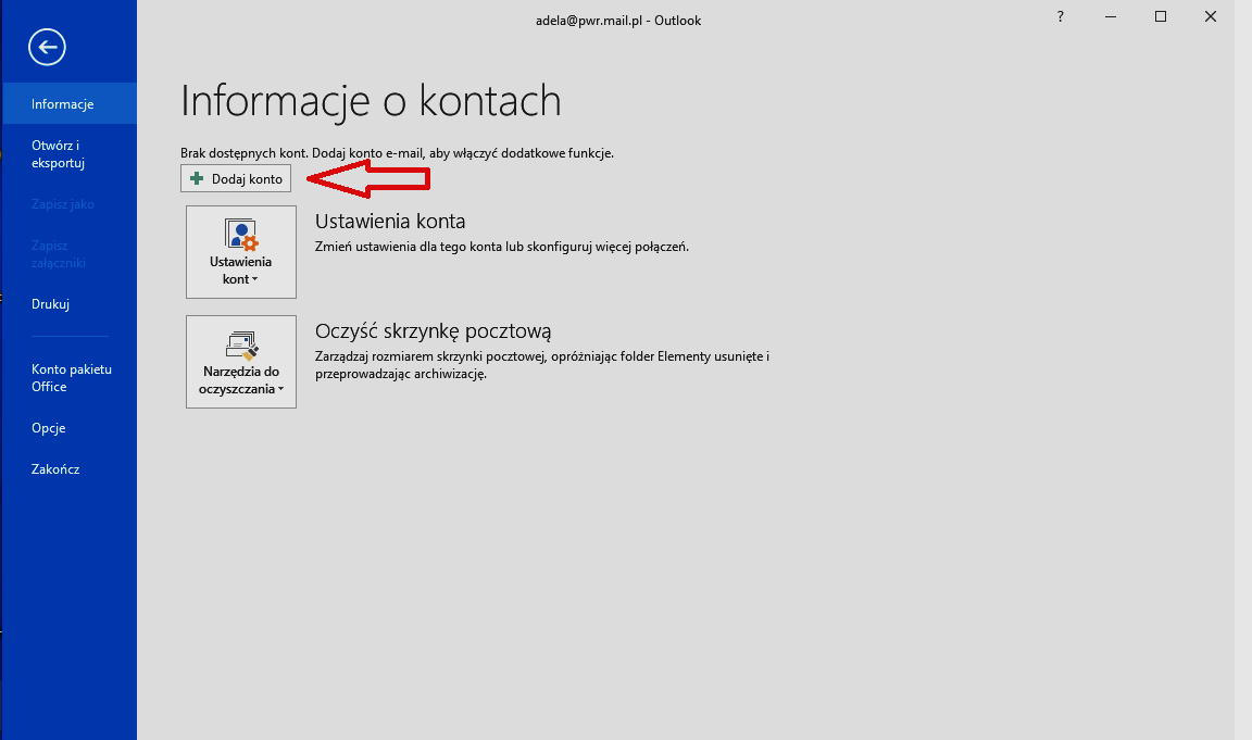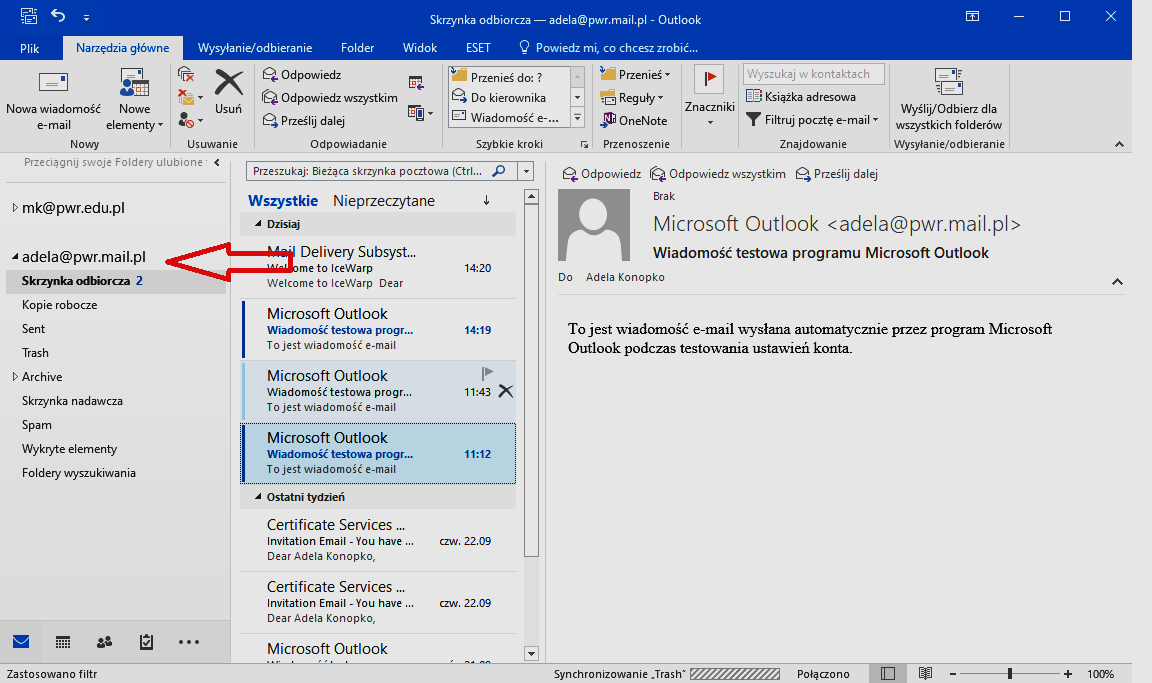 W efekcie poprawnie zakończonej konfiguracji po lewej stronie programu wyświetlony zostanie nagłówek skonfigurowanego konta pocztowego.
