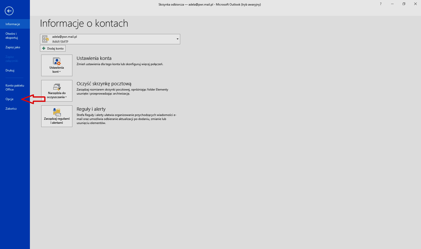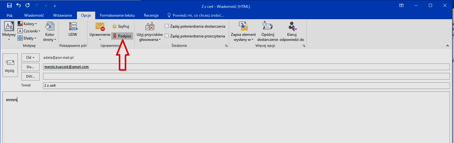 Klient pocztowy Outlook dopuszcza podpisywanie poczty wysyłanej certyfikatem nadawcy. Certyfikat musi być zaczytany do klienta pocztowego, w tym celu należy przeprowadzić poniższą procedurę. Przechodzimy do opcji programu Outlook: