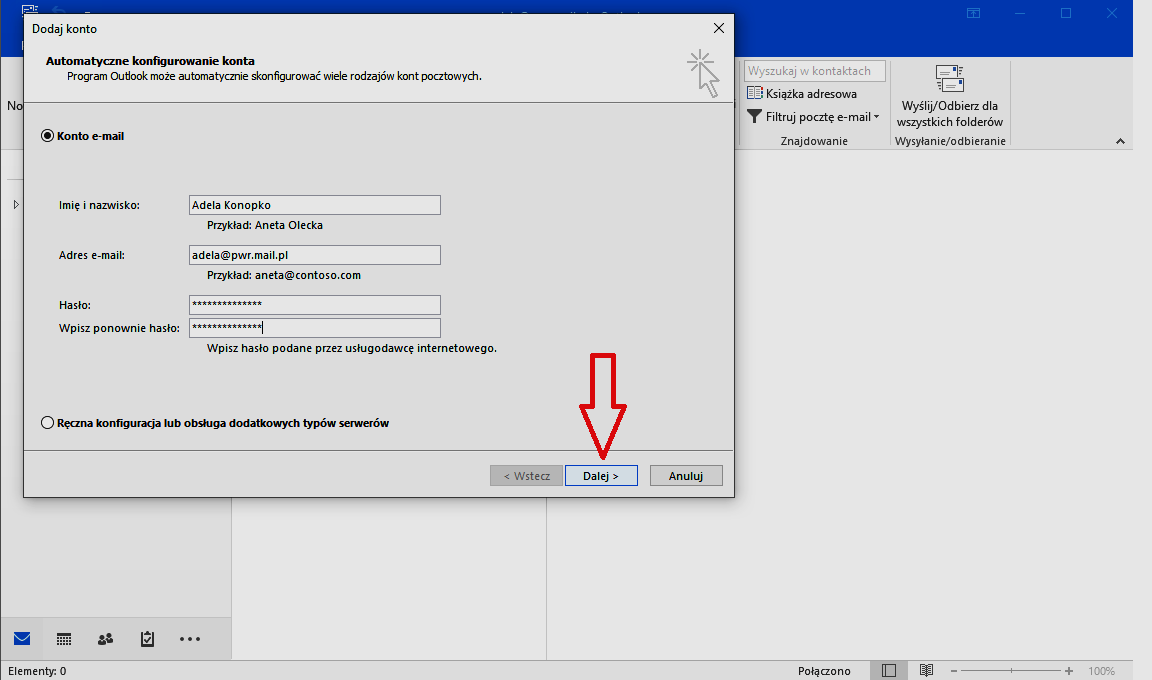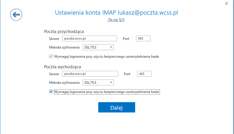 W wywołanym oknie wpisujemy dane konfiguracyjne i wysyłamy dane do serwera poprzez klikniecie na ikonę „Dalej”.