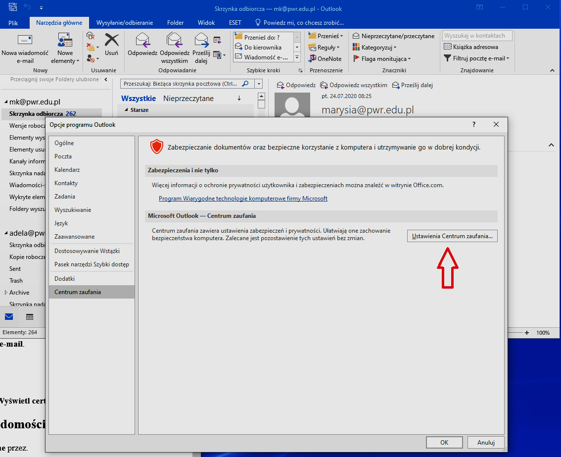 W wyświetlonych opcjach wybieramy Centrum zaufania i przechodzimy do ustawień Centrum zaufania