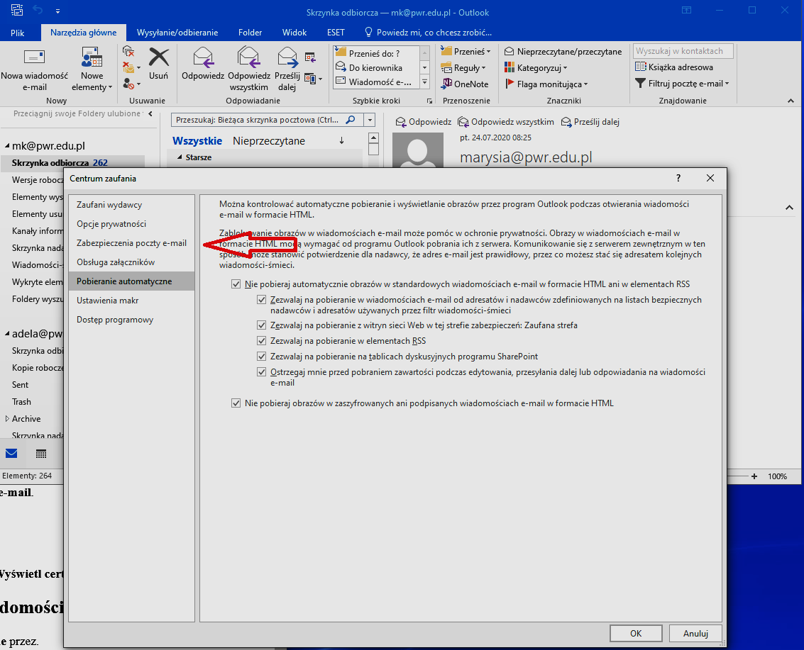 Na ekranie wyświetlone zostaną reguły Pobierania automatycznego, z którymi się zapoznajemy, a następnie po lewej stronie wybieramy odsyłacz do „zabezpieczenia poczty e-mail”.