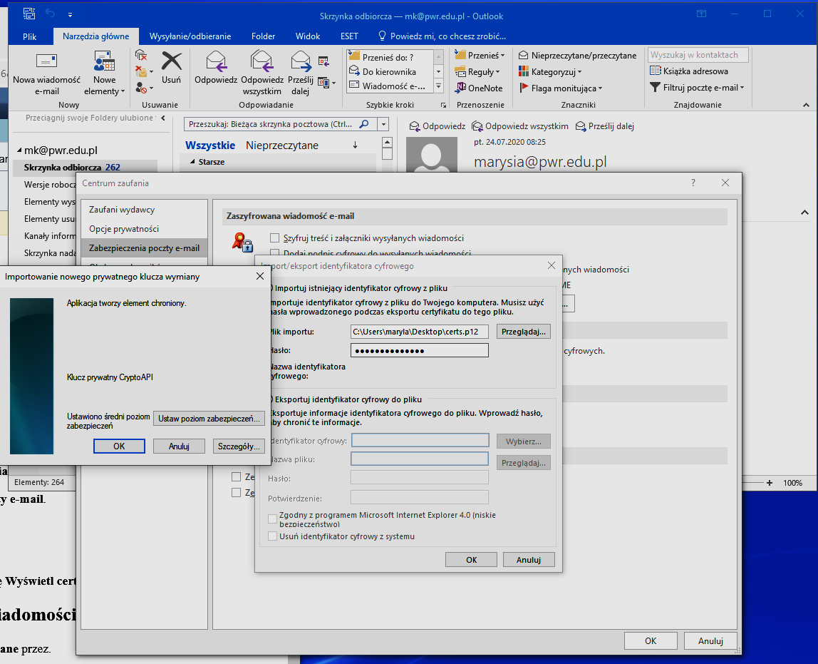 Poprawnie wprowadzone dane zostaną zaczytane a program zażąda akceptacji tworzonych elementów chronionych Po przejściu procedury zaczytania certyfikatu można przystąpić do wysłania maila z podpisem cyfrowym