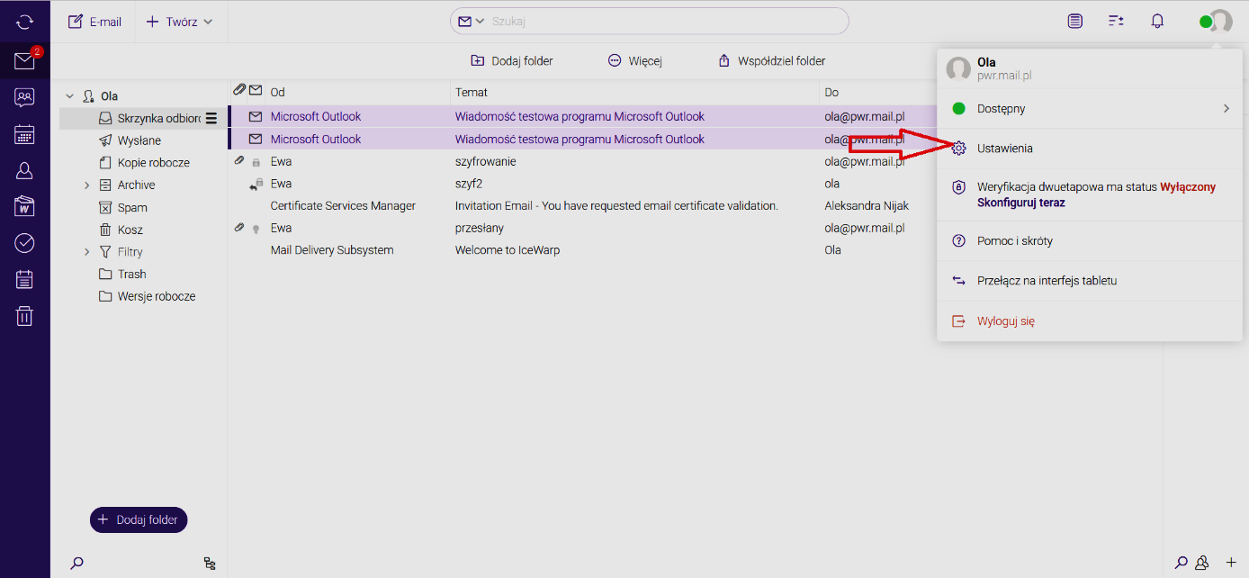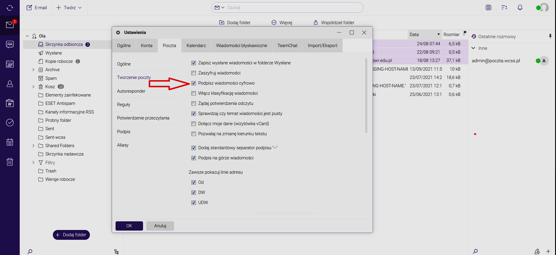 Przed wysłaniem wiadomości podpisanych własnym certyfikatem musimy sprawdzić ustawienia poczty. System musi być poinformowany, że ma podpisywać wysyłane wiadomości W tym celu należy sprawdzić, czy w ustawieniach jest zaznaczone podpisywanie wiadomości cyfrowo.