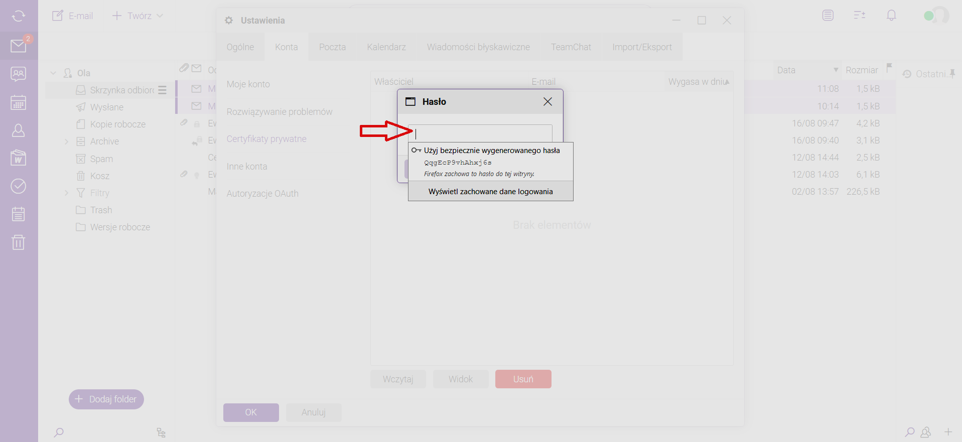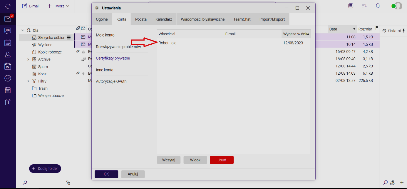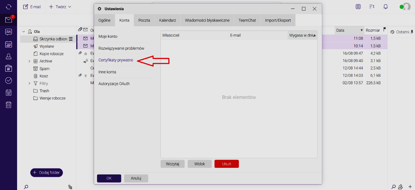 W zakładce „Konta” wywołujemy „certyfikaty prywatne”: