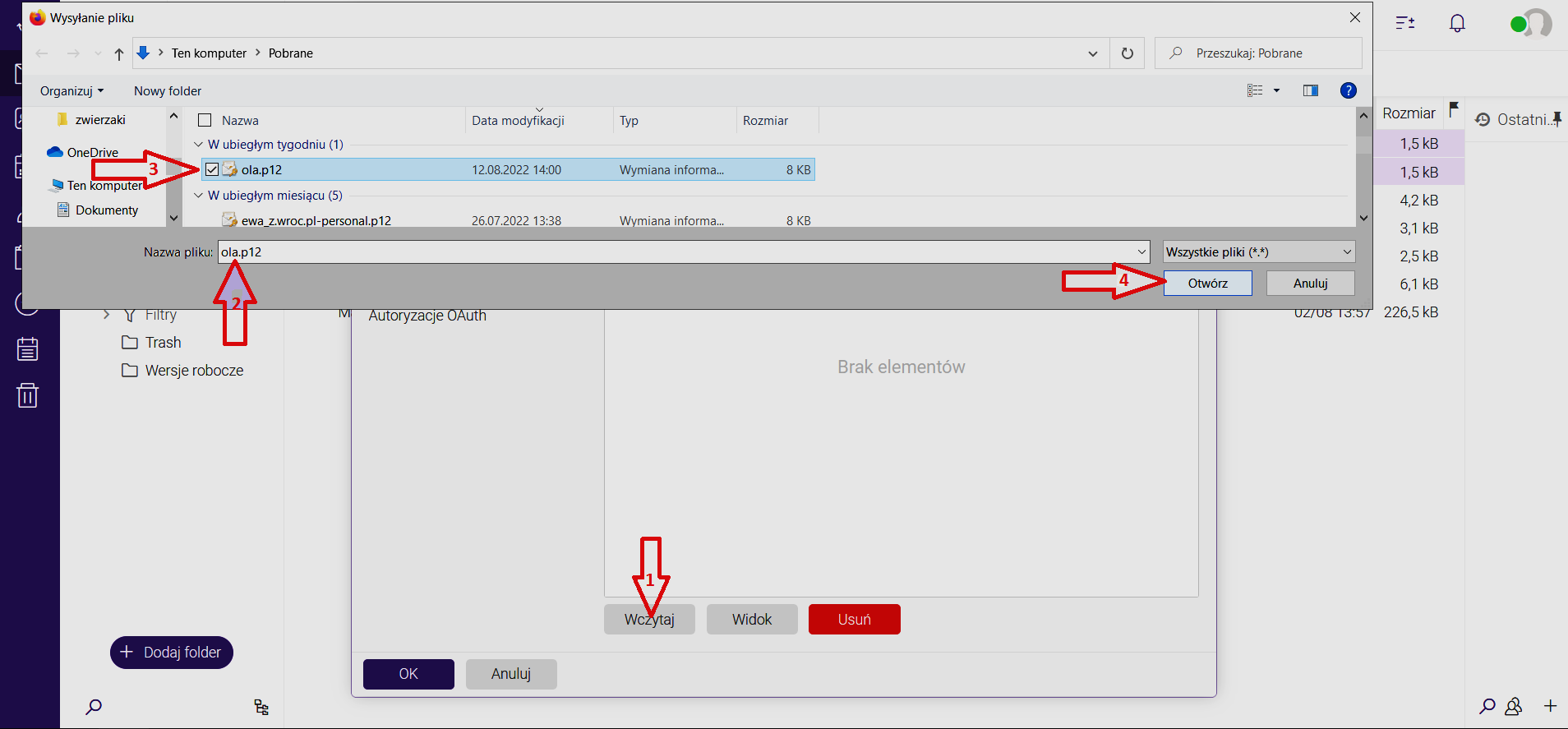 Na lokalnym komputerze, z którego wykonujemy opcję wczytania prywatnego certyfikatu (w tym wypadku jest to plik ola.p12), wyszukujemy plik z certyfikatem.