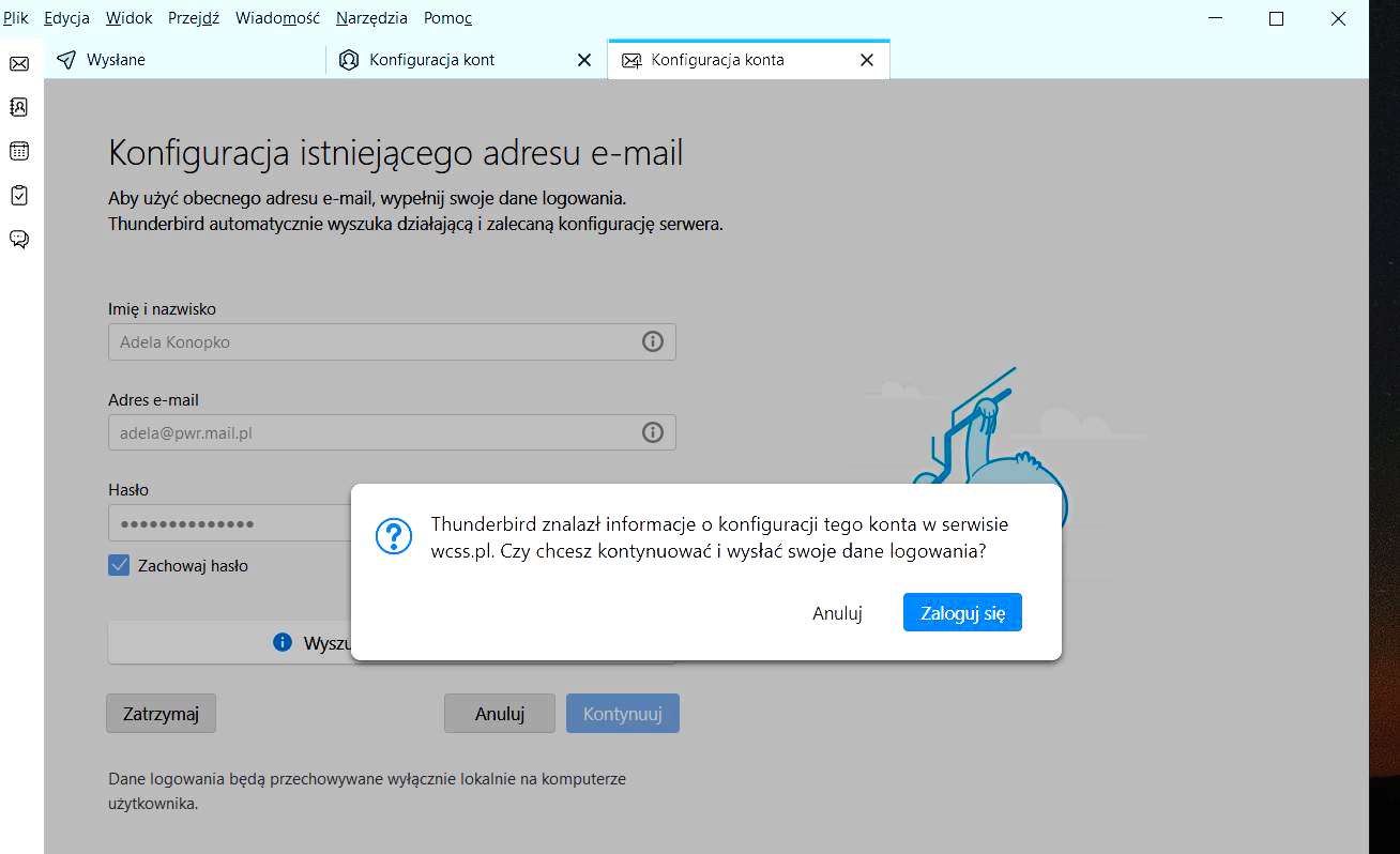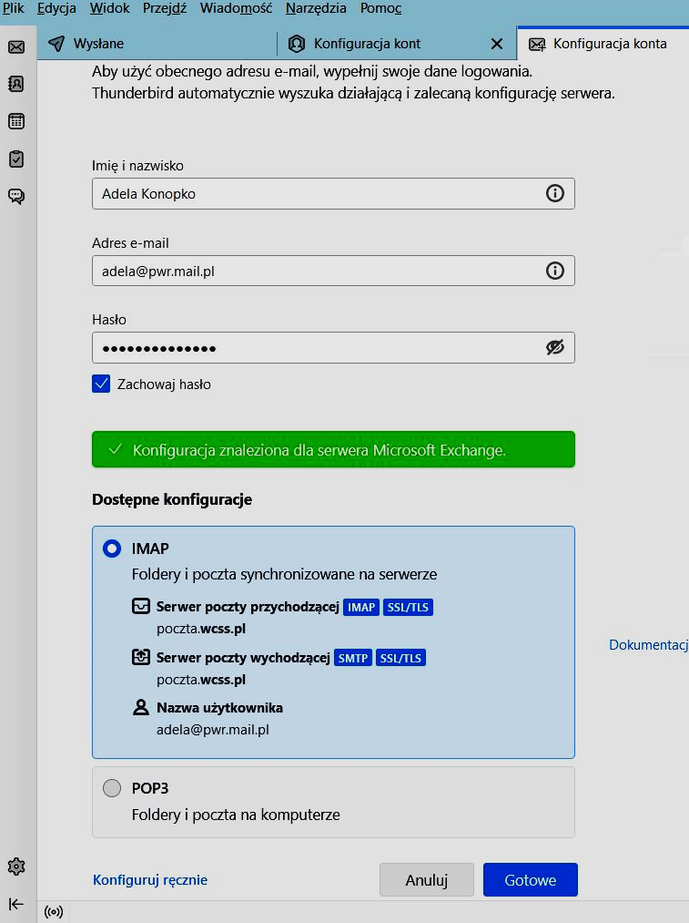 Podanie adresu mailowego wraz z domeną wyzwala automatyczne podstawienie potrzebnych danych dotyczących serwerów. Procedura znacznie ułatwia konfigurację i należy ją zaakceptować