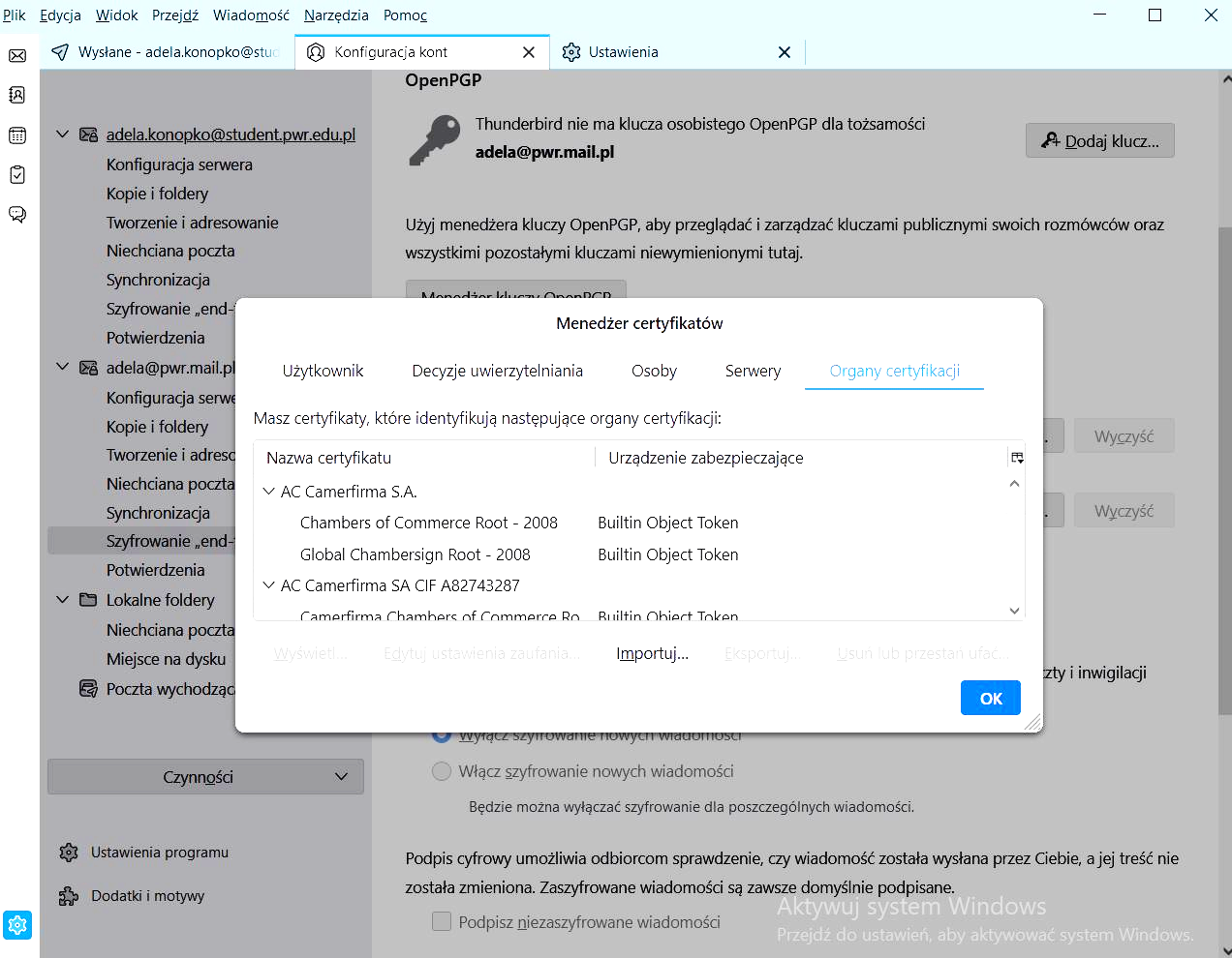 Poniżej podano procedurę dołączenie certyfikatu personalnego którym będą podpisywane wiadomości