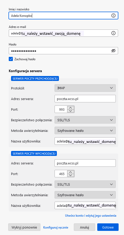 Poniżej przedstawiono przykładowe ustawienia w przypadku samodzielnego konfigurowania konta w kliencie Thunderbird.
